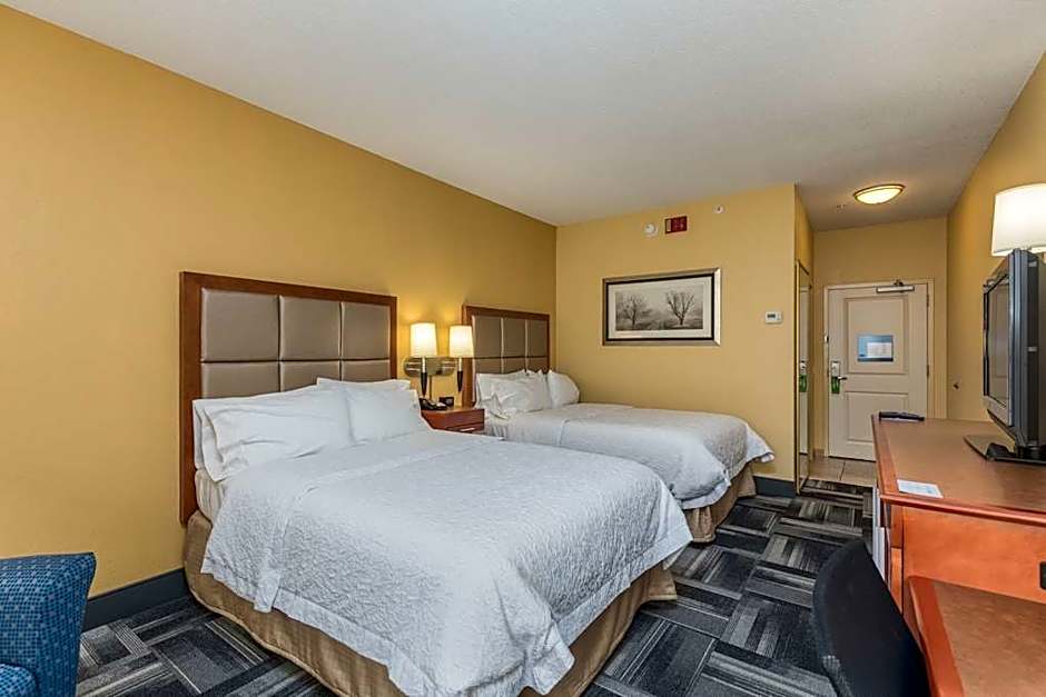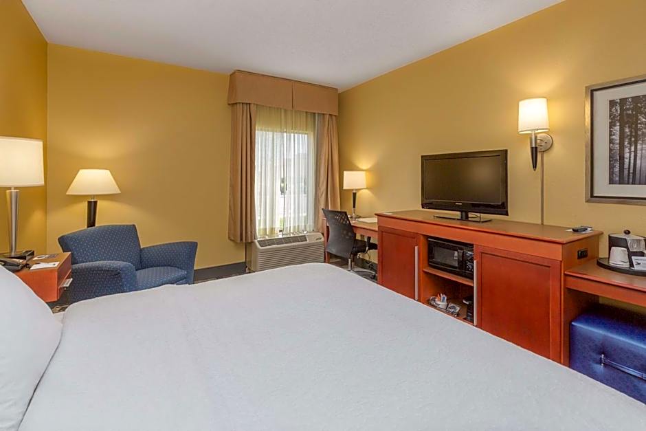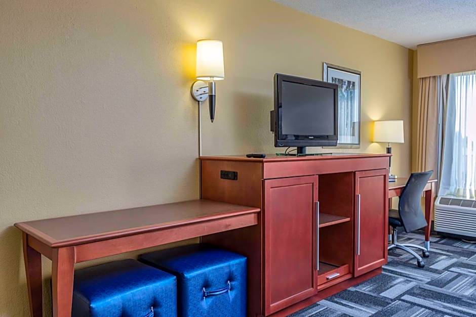 This room features a flat-screen TV with cable channels, a microwave, refrigerator, and a work desk.